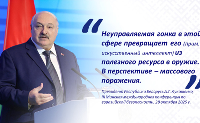 .Президент Беларуси А.Г.Лукашенко, выступая на III Минской междунапродной конференции по евразийской безопансости, как одну из ключевых задач в целом обозначил необходимость принятия мер в области искусственного интеллекта: «Неуправляемая гонка в этой сфере превращает его из полезного ресурса в оружие. В перспективе – массового поражения».