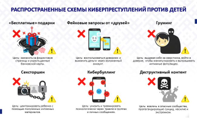 Справочно:Способы киберпреступлений в отношении детей и подростков:«бесплатные» подарки и розыгрыши, когда ребенку для получения выигрыша предлагается перейти по ссылке и ввести платежные и иные данные его родителей. Основная цель – украсть данные банковских карт или учетных записей;«фейковые» запросы от друзей, когда с использованием взломанного аккаунта друга ребенка просят помочь (перевести денежные средства), а ребенок, желая помочь, может не усомниться в личности просящего;«груминг», когда взрослый злоумышленник под видом сверстника втирается в доверие к ребенку в соцсетях или играх, постепенно выведывает личную информацию, манипулирует, вызывает чувство близости, а затем может выпрашивать интимные фото/видео или назначать личную встречу, что может привести к совершению в отношении ребенка действий сексуального характера, которые ребенок в силу возраста не может оценивать, как социально-значимые, считая происходящее игрой;«сексторшен», когда преступник, получив интимные фото или видео (добровольно отправленные ребенком или через взлом камеры), начинает шантажировать ребенка, вымогая как материальные блага, так и услугу, в том числе сексуального характера;кибербуллинг (или травля), когда создаются группы и паблики для насмешек, унизительных комментариев, отправляются угрозы в личных сообщениях, чтобы причинить ребенку психологическую боль, что нередко может закончится депрессией или даже самоубийством;вовлечение в опасные сообщества, пропагандирующие депрессивные течения, суицид, анорексию, насилие или экстремизм, которые преподносятся ребенку как что-то «модное», «крутое» и «запретное».