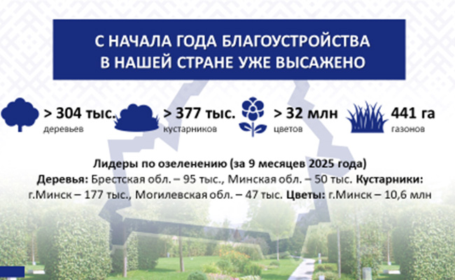 Беларусь цветущая и процветающаяОзеленение и высадка насаждений направлены не только на снижение углеродного следа, но и на преображение населенных пунктов и создание настроения жителям и гостям.С начала года высажено свыше 304 тыс. деревьев. Лидерами по посадке деревьев за 9 месяцев являются Брестская (95 тыс.) и Минская (50 тыс.) области.В разных уголках страны высажено 377 тыс. кустарников. Безусловным лидером стал г.Минск, где высадили 177 тыс. кустарников, в том числе основной акцент был сделан на Минской кольцевой автомобильной дороге.По цветочному оформлению в этом году в стране установлен своего рода рекорд. По данным Минприроды, за 9 месяцев высажено32 млн цветов (в 2024 г. – 20,5 млн цветов). Больше всего высажено в столице – 10,6 млн цветов. Огромная работа проделана по высадке цветов, созданию клумб и цветочных композиций: в Могилевской области – 3,6 млн цветов; Брестской, Гомельской и Гродненской – по 3,5 млн.Справочно:В Гродненской области в рамках реализации Плана мероприятий по проведению Года благоустройства за 9 месяцев 2025 года обустроено 15,17 гектаров газонов (91,3 % к плану), высажено 28,19 тысяч деревьев (65,9 %), 17,77 тысяч штук кустарников (151,9 %).