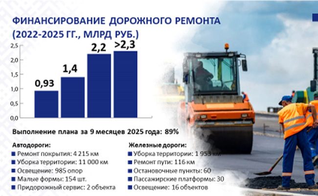 Образцовая инфраструктура – новые стандарты качества жизниОдна из главных задач Года благоустройства – максимальное улучшение инфраструктуры и поддержание в надлежащем состоянии территорий вдоль автомобильных и железных дорог.Понимая, что качественная автодорожная сеть способствует безопасным и комфортным поездкам пассажиров, грузоперевозкам, за последние годы значительно увеличилось финансирование на ремонт и реконструкцию республиканских и местных дорог (2022 год – 930 млн, 2025 год – более 2,3 млрд рублей).