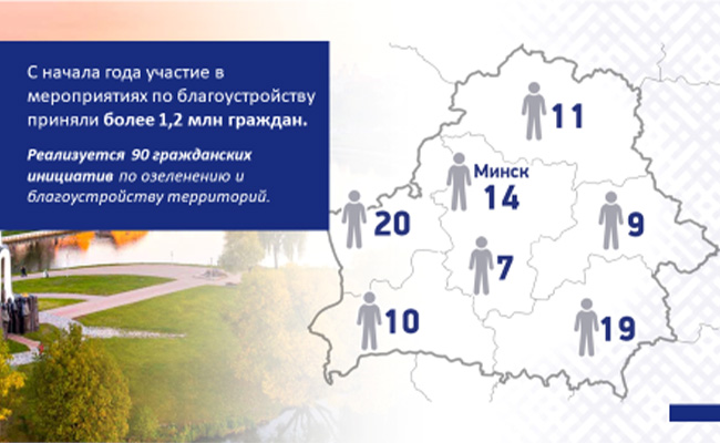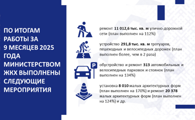 Любовь к малой родине и всей нашей стране проявляется не на словах, а в делах. Участие в субботниках – это выражение каждым своей гражданской позиции и, что немаловажно, воспитание молодого поколения белорусов личным примером через труд на благо общества. Мы хозяева на своей земле и в ответе за порядок на ней.Благоустройство и наведение порядка в населенных пунктахЗа 9 месяцев текущего года в рамках работы Министерства ЖКХ выполнен ремонт более 11 млн кв. м улично-дорожной сети, сделано более 290 тыс. кв. м тротуаров, пешеходных и велосипедных дорожек; обустроено и отремонтировано 313 автомобильных и велосипедных парковок и стоянок, установлено более 8 тыс. малых архитектурных форм, отремонтированы – более 20 тыс.