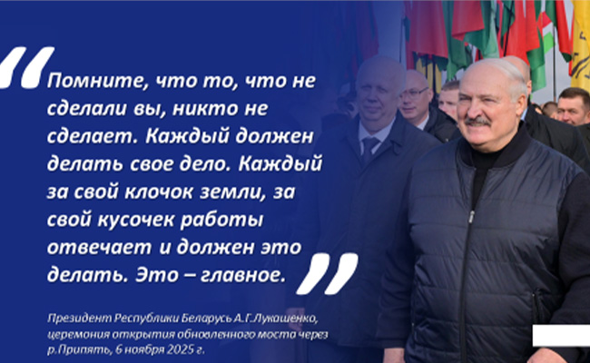 Настраивая на продуктивную работу, Глава государства А.Г.Лукашенко подчеркивает: «Помните, что то, что не сделали вы, никто не сделает. Каждый должен делать свое дело. Каждый за свой клочок земли, за свой кусочек работы отвечает и должен это делать. Это – главное».