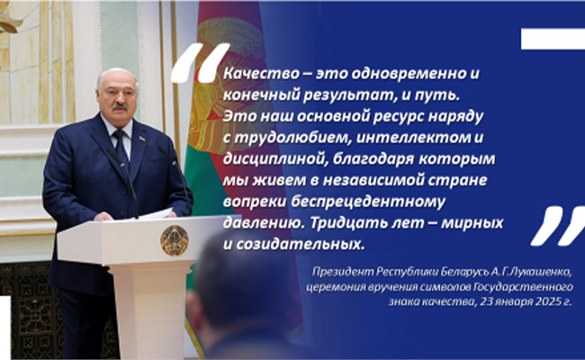 Пятилетка качества 2025–2029 гг. является актуальной стратегией развития страны и ответом на вызовы времени. Сегодня жесткая конкуренция наблюдается во всех сферах (от производства до гражданского общества) и на всех уровнях (от личной профессиональной реализации и до укрепления позиции страны в глобальном миропорядке).Вручая первые в истории суверенной Беларуси Государственные знаки качества, Глава государства отметил: «Качество – это одновременно и конечный результат, и путь. Это наш основной ресурс наряду с трудолюбием, интеллектом и дисциплиной, благодаря которым мы живем в независимой стране вопреки беспрецедентному давлению. Тридцать лет – мирных и созидательных».