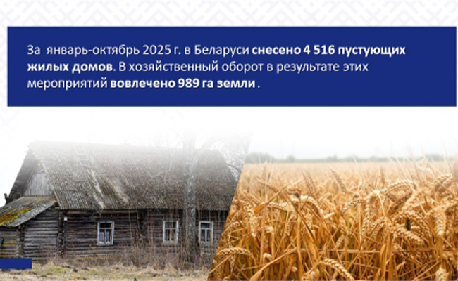 Заслуживает внимания работа по эстетизации фасадов зданий. Муралы на различные темы появились во многих белорусских городах: Минске, Бресте, Дзержинске, Заславле, Пинске, Узде, Гомеле, Жабинке, Гродно и др.Уличное освещение создает комфорт и обеспечивает безопасность. За отчетный период Министерством ЖКХ осуществлен ремонт 4 849 опор наружного освещения и выполнена замена 64 550 светильников на светодиодные, что к тому же позволяет экономить электроэнергию.Развитие инфраструктуры водоснабжения, замена устаревших труб, использование современных технологий фильтрации и очистки воды, создание эффективной системы очистных сооружений – все эти задачи решаются. Например, один из масштабных проектов в этой сфере реализован в начале текущего года – завершение перевода на подземные источники питьевого водоснабжения всех потребителей столицы нашей Родины.Мероприятия по благоустройству охватывают и крупные города, и уютные агрогородки – высаживаются новые деревья, устанавливаются детские или спортивные площадки, а в маленькой деревушке на несколько жителей, в первую очередь, разбираются с пустующими и ветхими домами, а неиспользуемые участки передаются сельхозпредприятиям для вовлечения в сельхозоборот. За январь–октябрь 2025 г. в стране снесено 4 516 пустующих жилых домов. В хозяйственный оборот в результате этих мероприятий вовлечено 989 га земли.Справочно:В Гродненской области работа по сносу пустующих и ветхих жилых домов шла опережающими темпами: вместо запланированных 485 зданий было снесено 505. За 9 месяцев 2025 года вовлечено в хозяйственный оборот земельных участков после сноса пустующих домов 130 га, неиспользуемых земельных участков (за исключением плодовых садов) – 146,56 га (65 %).В 2025 году исполнительными комитетами приняты решения об узаконивании 754 самовольно занятых земельных участков в населенных пунктах с внесением в местный бюджет за право легализации самовольно занятых земельных участков 1,64 млн. рублей.