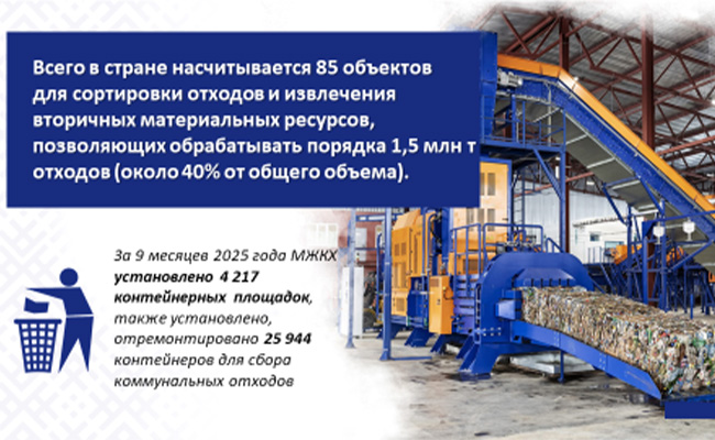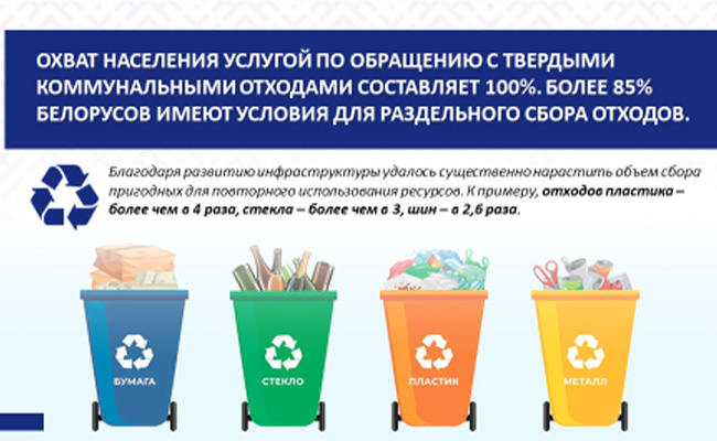 Чисто не там, где убирают, а там, где не сорят!Понятие чистоты и ухоженности населенных пунктов тесно связано с системой обращения с отходами: строятся и модернизируются мусоросортировочные комплексы; внедряются новые методы и технологии использования твердых коммунальных отходов (далее – ТКО) и др. Охват населения услугой по обращению с ТКО составляет 100%. С начала года оборудовано более 4 тыс. контейнерных площадок, отремонтировано почти 26 тыс. контейнеров.Справочно:В стране насчитывается 85 объектов для сортировки ТКО и извлечения вторичных материальных ресурсов (в г. Минске, областных центрах, также в городах Барановичи, Орша, Бобруйск и Новополоцк функционируют 10 крупных мусоросортировочных комплексов, в районах – 75 линий сортировки ТКО), позволяющих обрабатывать порядка 1,5 млн т отходов (около 40% от общего объема). Ежегодно в Беларуси образуется около 4,3 млн т твердых коммунальных отходов.
