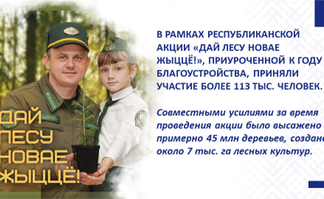 Беречь и приумножать это достояние помогают ежегодные республиканские общественные акции по восстановлению белорусских лесов «Дай лесу новае жыццё!», «Неделя леса».Участие в экологических акциях и проектах формирует чувство сопричастности, ответственности и гордости за страну. Например, только в этом году участие в республиканской акции «Дай лесу новае жыццё!» приняли около 113 тыс. человек. Совместными усилиями за время проведения акции было высажено порядка 45 млн саженцев деревьев, создано около 7 тыс. га лесных культур.